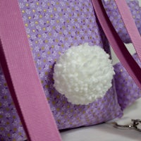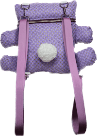Bunny stuffed animal backpack with adjustable and removable straps. Main pocket is roughly 11” x 9”. Pom pom tail. YKK zipper. Handmade.