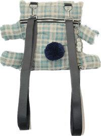 Bunny stuffed animal backpack with adjustable and removable straps. Main pocket is roughly 11” x 9”. Pom pom tail. YKK zipper. Handmade.