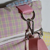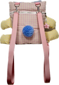 Bunny stuffed animal backpack with adjustable and removable straps. Main pocket is roughly 11” x 9”. Pom pom tail. YKK zipper. Handmade.